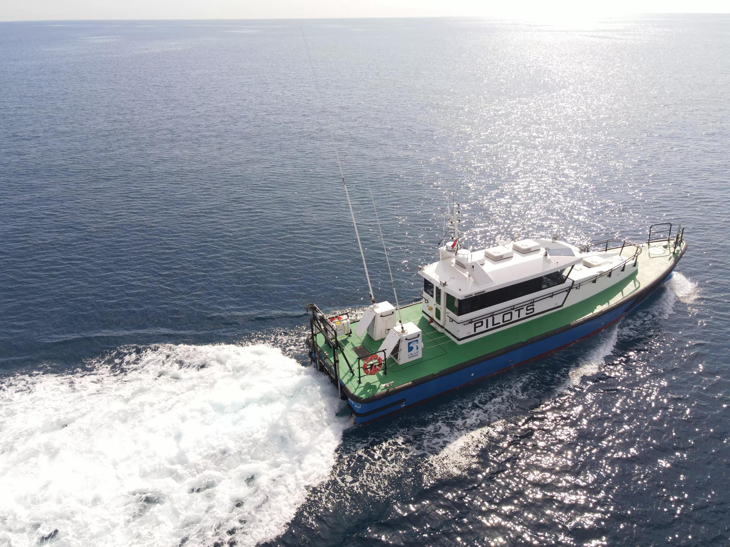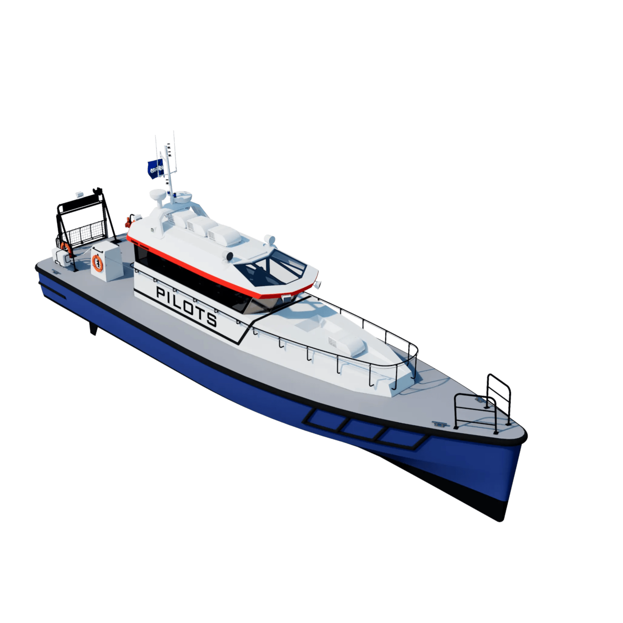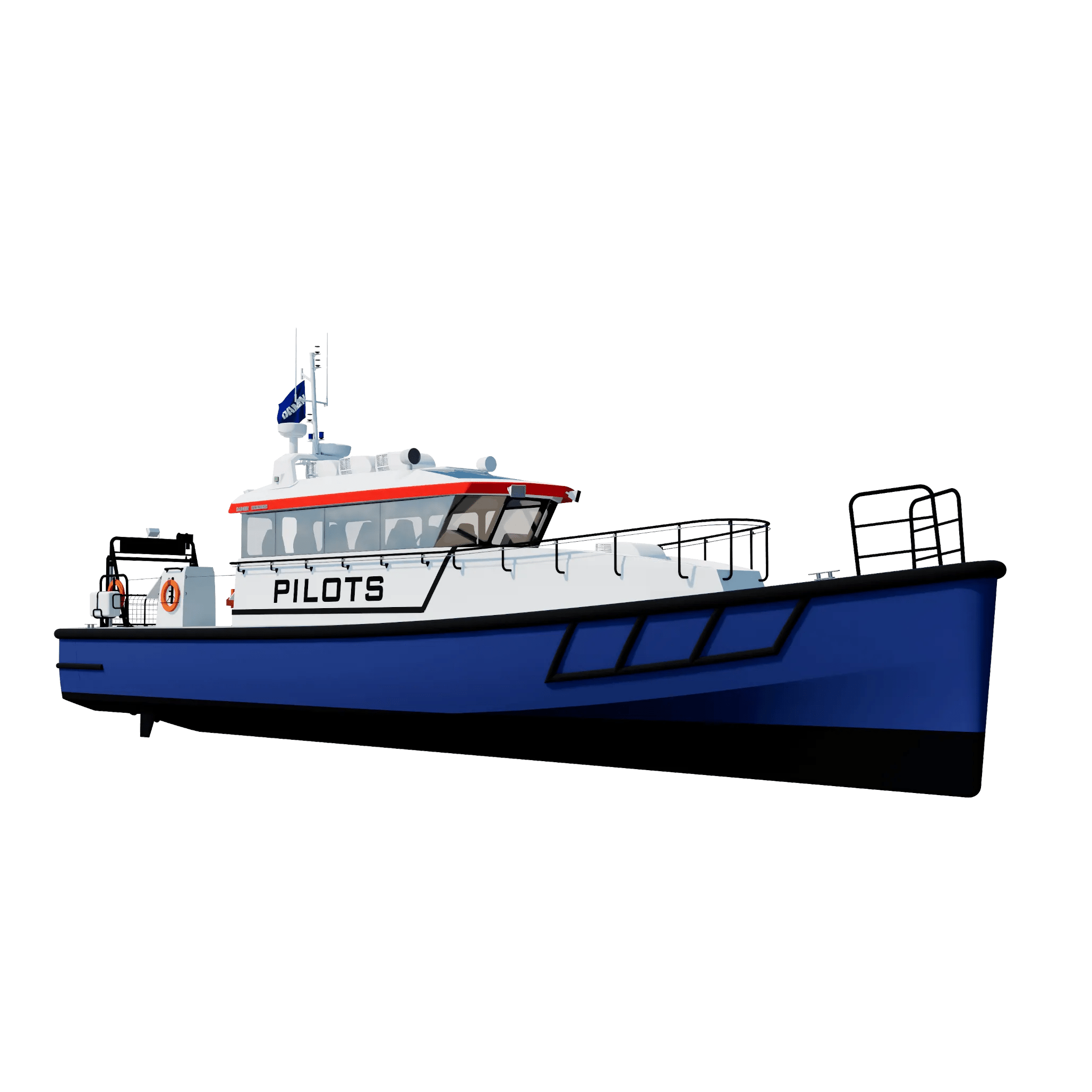 The Damen Stan Pilot 1905 is a modern vessel of proven, standard design built of aluminium and featuring a modified Axe Bow for excellent seakeeping. Its use of high quality components ensures outstanding performance and low maintenance. Safety is optimised via a 360-degree view from the wheelhouse and large deck for safe boarding. The vessel is propelled by waterjets driven by diesel engines.