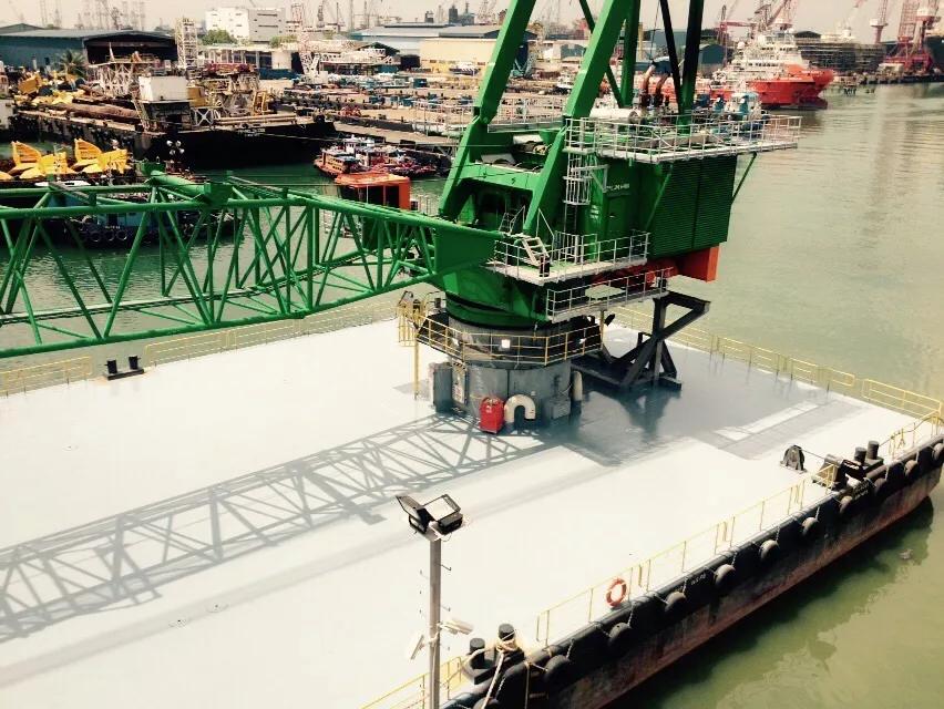 Floating crane for construction of heavy marine works, jetties, monopiles, or for lifting of heavy topsides and pipe rack units.