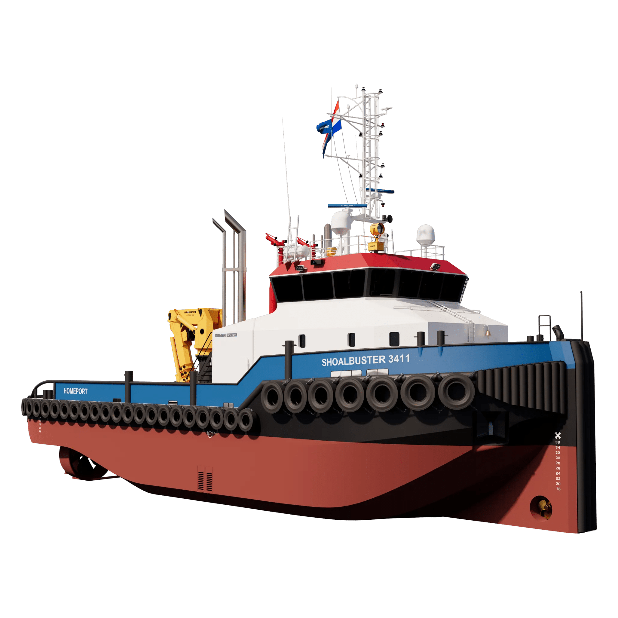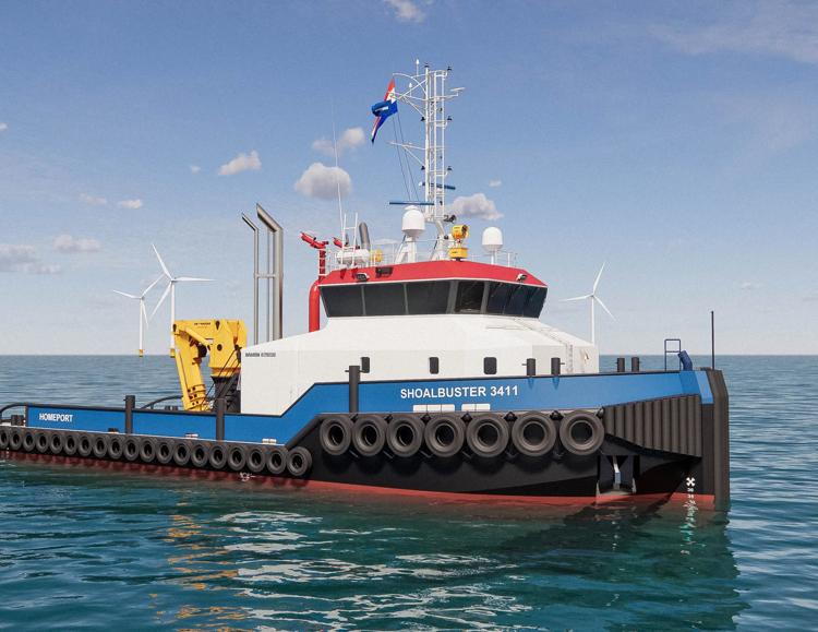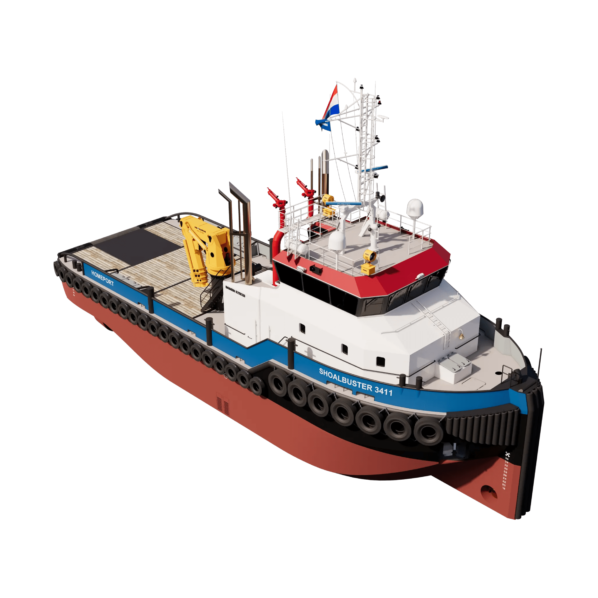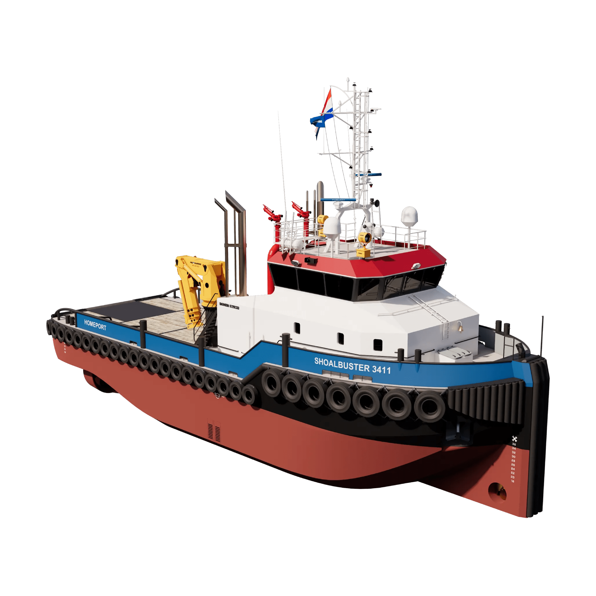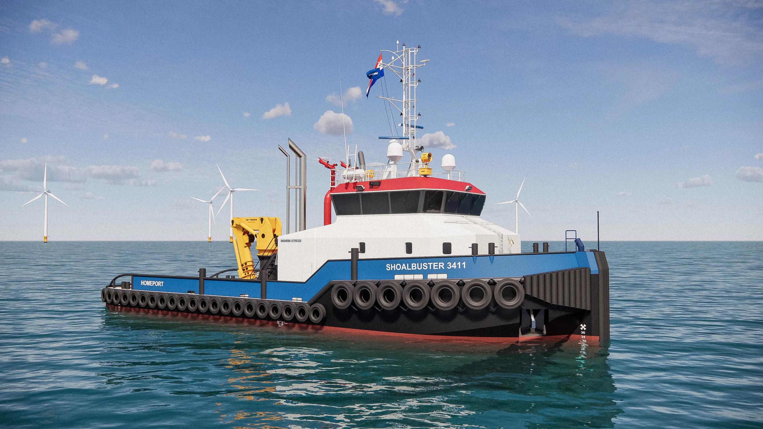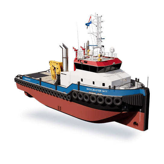 The Damen Shoalbuster 3411 is a true multi-purpose workhorse, engineered to tackle a wide range of demanding tasks including oceangoing towage, mooring, anchor handling, pushing, and even optional firefighting capabilities.